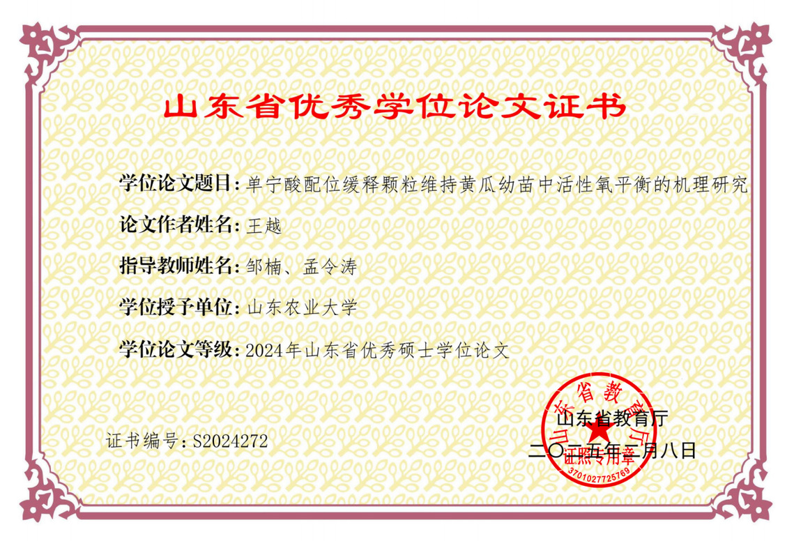 单宁酸配位缓释颗粒维持黄瓜幼苗中活性氧平衡的机理研究,2024年山东省优秀硕士学位论文,王越,2025年2月