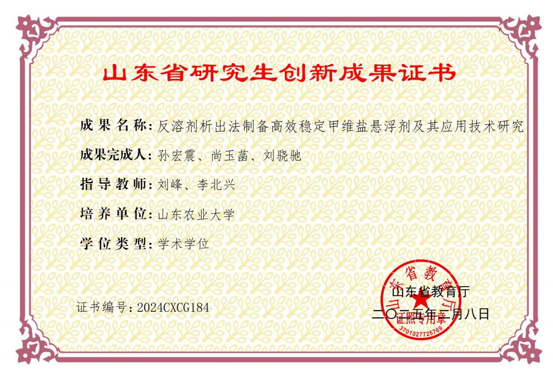 反溶剂析出法制备高效稳定甲维盐悬浮剂及其应用技术研究,2024年山东省研究生创新成果,孙宏震、尚玉菡、刘骁驰,2025年2月