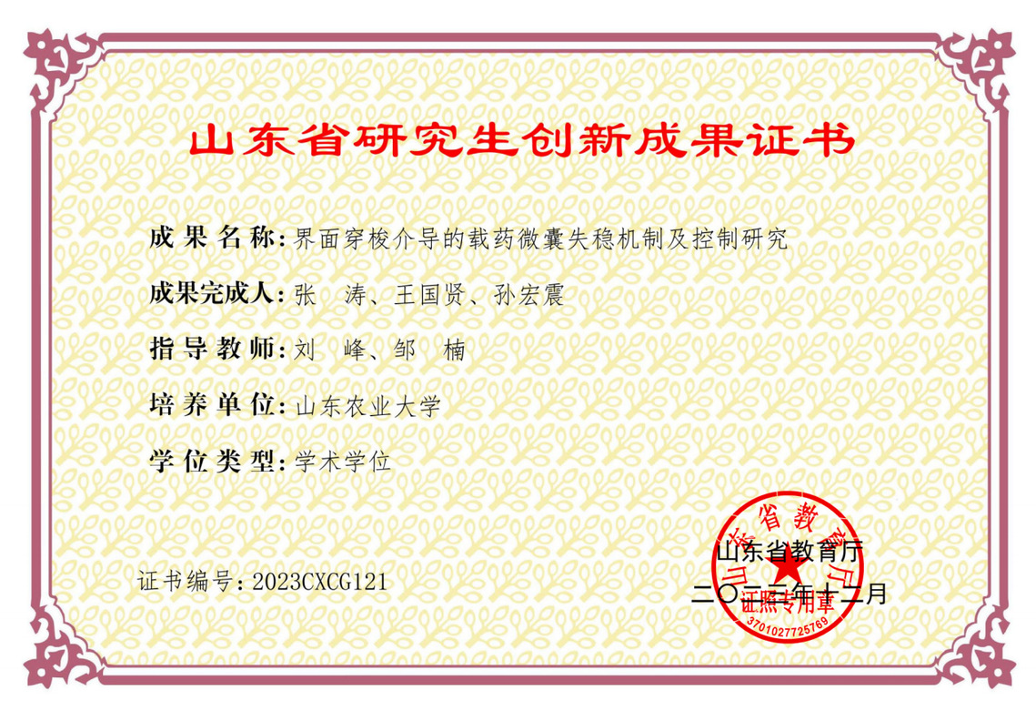 界面穿梭介导的载药微囊失稳机制及控制研究,2023年山东省研究生创新成果,张涛,2023年12月