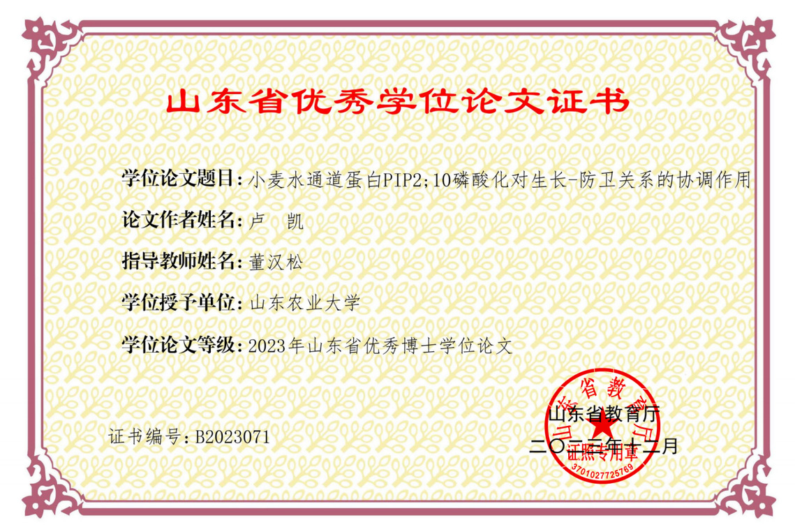 小麦水通道蛋白PIP2;10磷酸化对生长-防卫关系的协调作用,2023年山东省优秀博士学位论文,卢凯,2023年12月