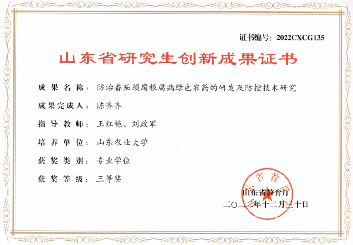 防治番茄颈腐根腐病绿色农药的研发及防控技术研究,2022 年山东省研究生创新成果三等奖,陈齐齐,2022年12月