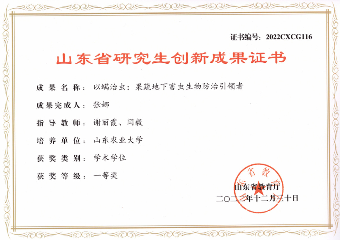 以螨治虫:果蔬地下害虫生物防治引领者,2022 年山东省研究生创新成果一等奖,张娜,2022年12月