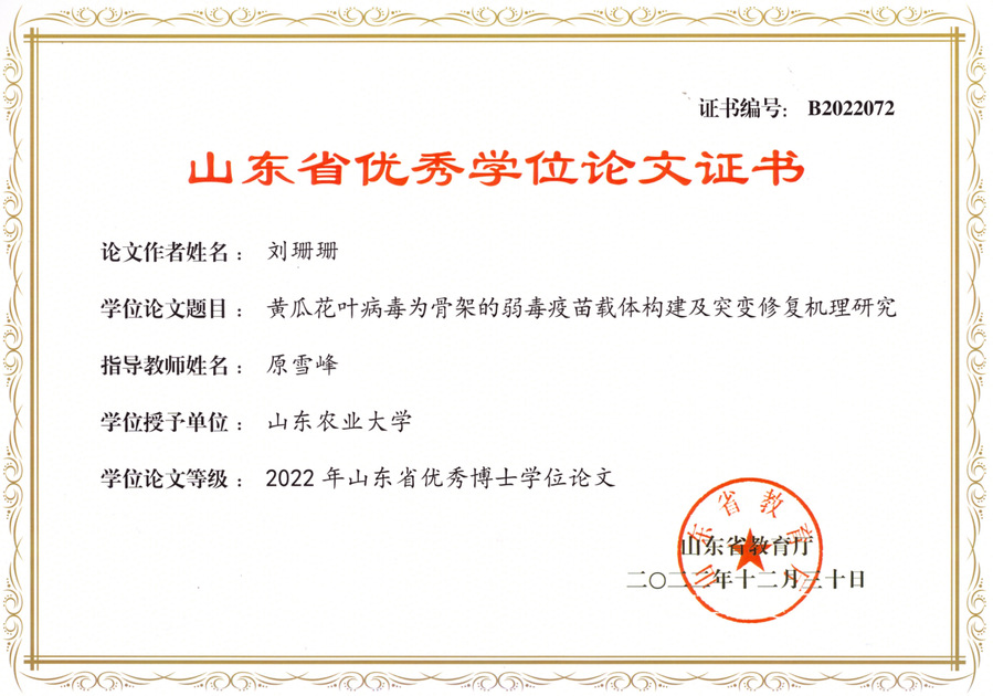 黄瓜花叶病毒为骨架的弱毒疫苗载体构建及突变修复机理研究,2022年山东省优秀博士学位论文,刘珊珊,2022年12月