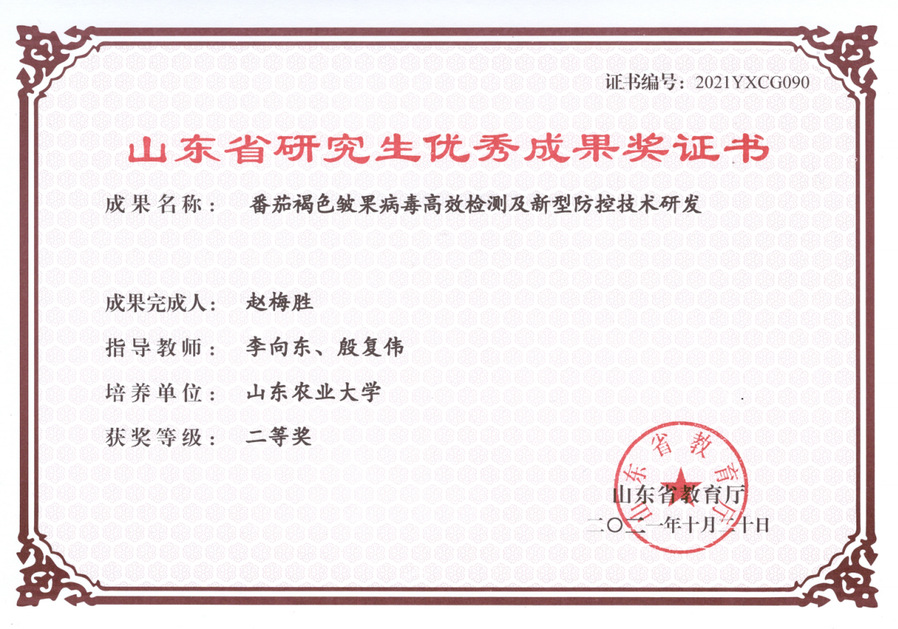 番茄褐色皱果病毒高效检测及新型防控技术研发,2021年山东省研究生优秀成果奖二等奖,赵梅胜,2021年10月