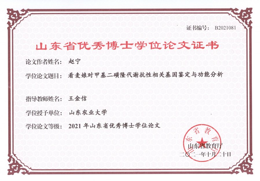 看麦娘对甲基二磺隆代谢抗性相关基因鉴定与功能分析,2021年山东省优秀博士学位论文,赵宁,2021年10月
