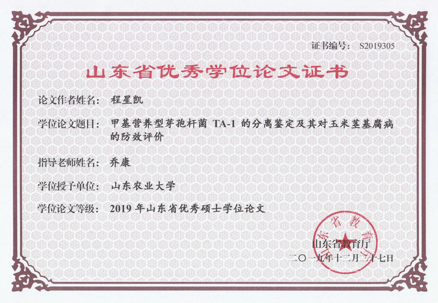 甲基营养型芽孢杆菌TA-1的分离鉴定及其对玉米茎基腐病的防效评价,2019年优秀硕士学位论文,程星凯,2019年12月