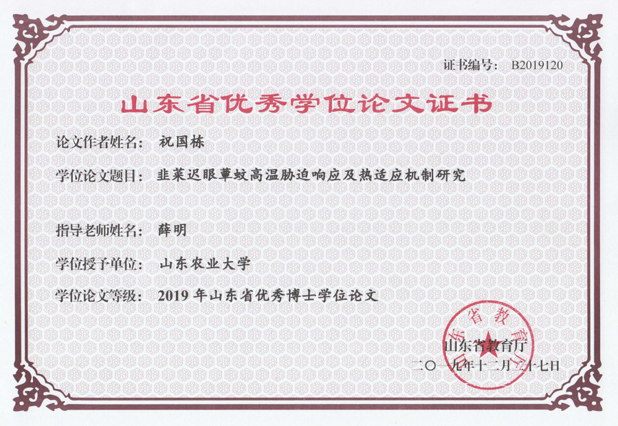 韭菜迟眼蕈蚊高温胁迫响应及热适应机制研究,2019年优秀博士学位论文,祝国栋,2019年12月