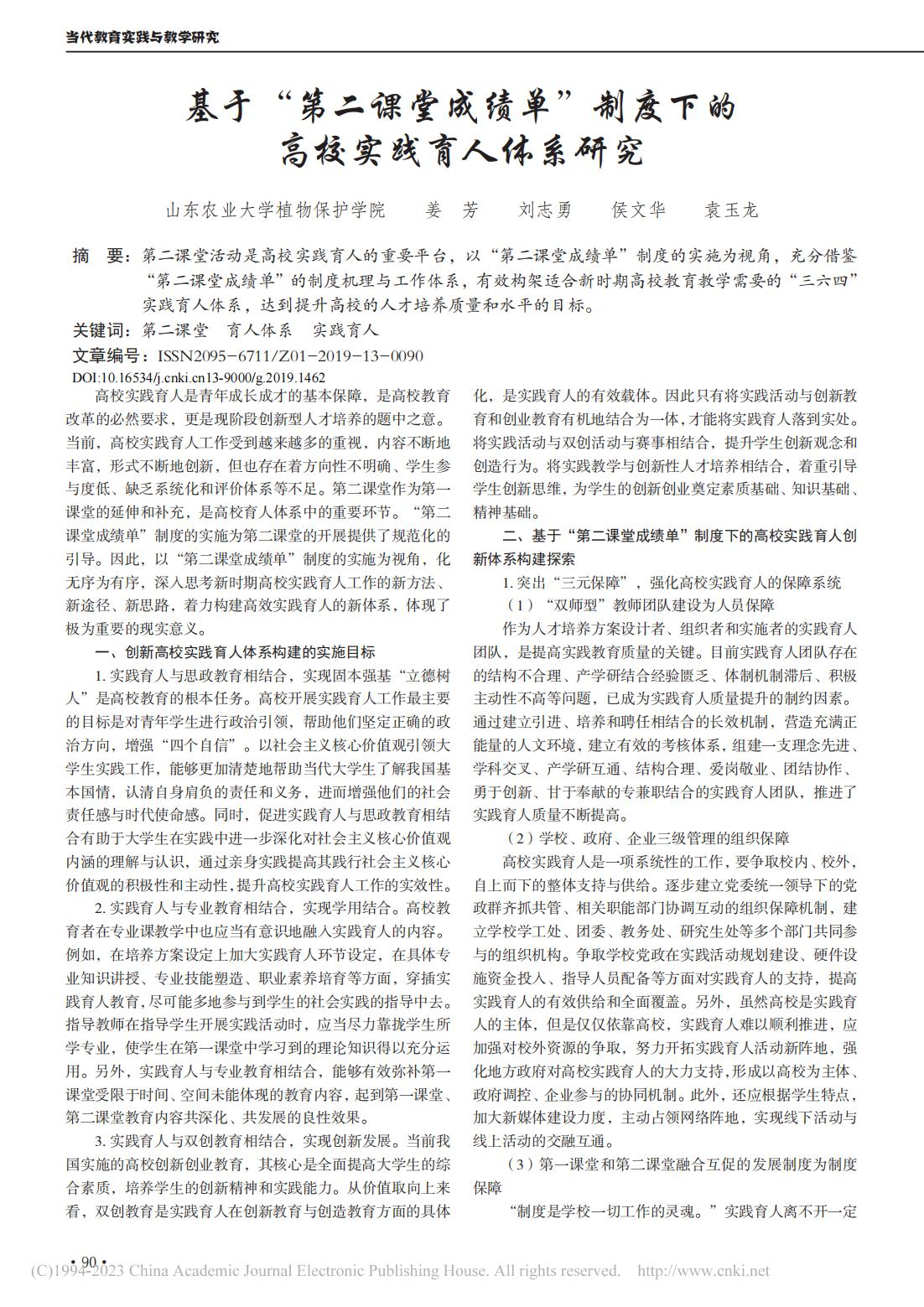 姜芳,刘志勇,侯文华,袁玉龙,基于“第二课堂成绩单”制度下的高校实践育人体系研究,当代教育实践与教学研究,2019,13:90-92.