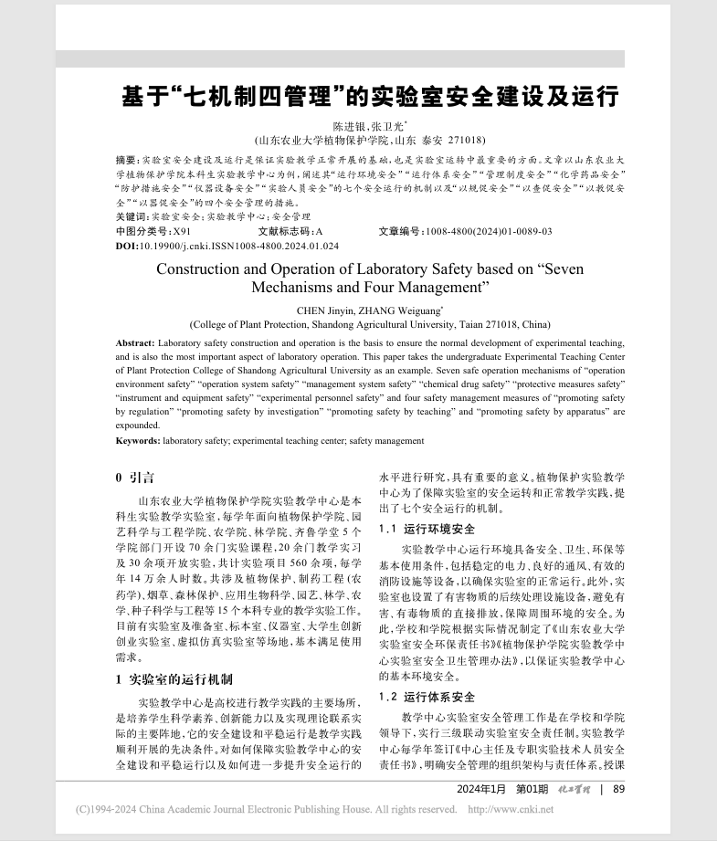 陈进银,张卫光. 基于“七机制四管理”的实验室安全建设及运行.化工管理,2024,01:89-91.