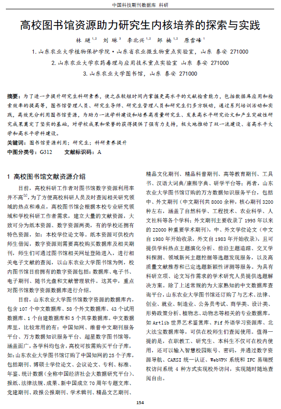 林琎,刘琳,李北兴,邹楠,原雪峰. 高校图书馆资源助力研究生内核培养的探索与实践. 中国科技期刊数据库 科研,2022,154-157.