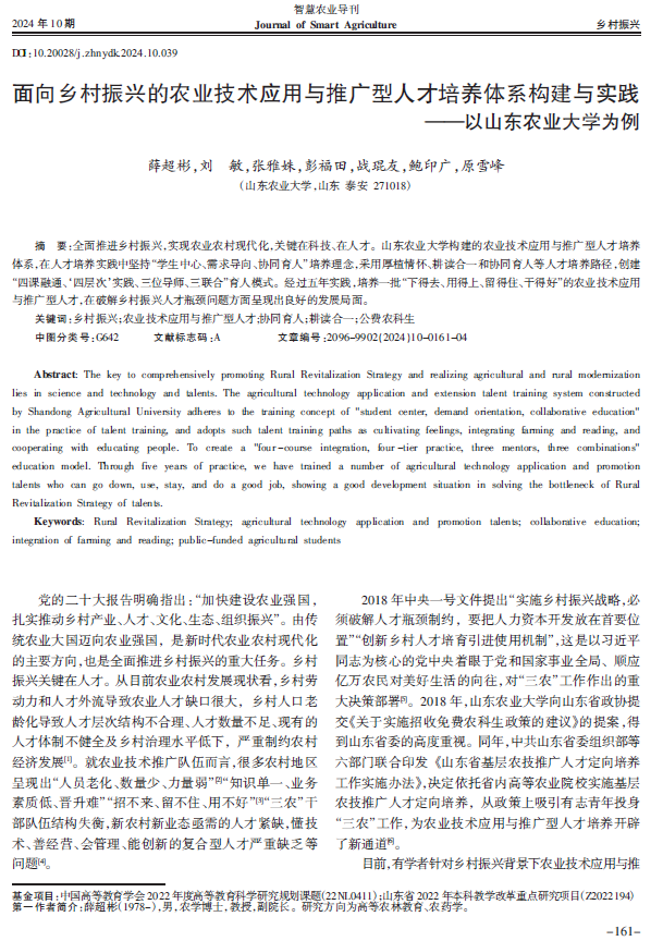 薛超彬,刘敏,张雅姝,彭福田,战琨友,鲍印广,原雪峰. 面向乡村振兴的农业技术应用与推广型人才培养体系构建与实践——以山东农业大学为例. 智慧农业导刊,2024,10:161-164.