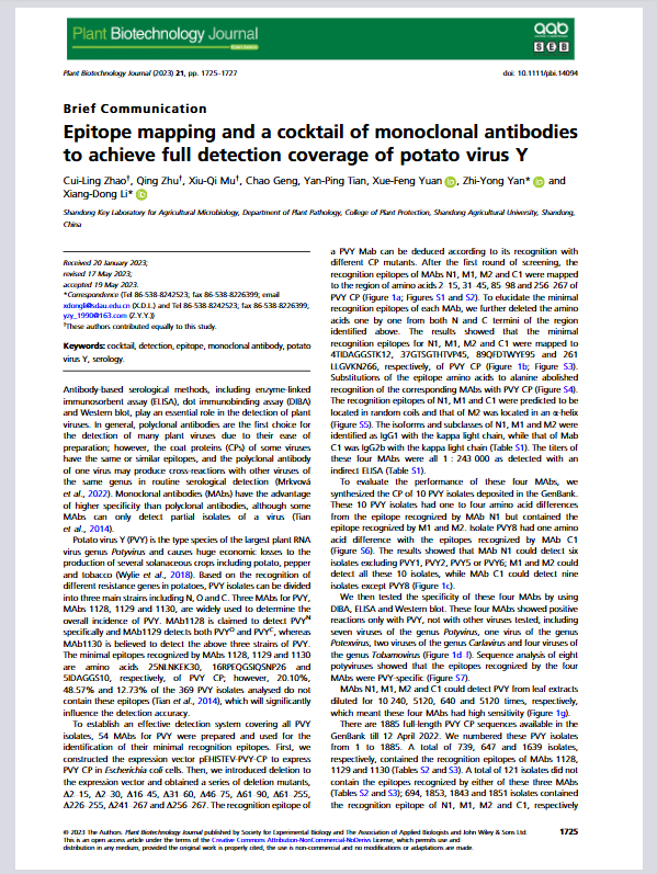 CuiLing Z ,Qing Z ,XiuQi M , et al.Epitope mapping and a cocktail of monoclonal antibodies to achieve full detection coverage of potato virus Y. Plant biotechnology journal,2023,21(9):1725-1727.