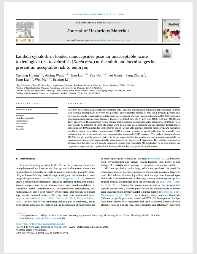 Xueping H ,Aiping W ,Jian L , et al. Lambda-cyhalothrin-loaded nanocapsules pose an unacceptable acute toxicological risk to zebrafish (Danio rerio) at the adult and larval stages but present an acceptable risk to embryos. Journal of Hazardous Materi