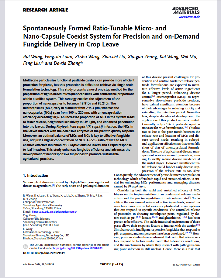Wang R ,Luan X F ,Wang S Z , et al. Spontaneously Formed Ratio-Tunable Micro- and Nano-Capsule Coexist System for Precision and on-Demand Fungicide Delivery in Crop Leave. Advanced materials (Deerfield Beach, Fla.),2024,36(45):e2409839.