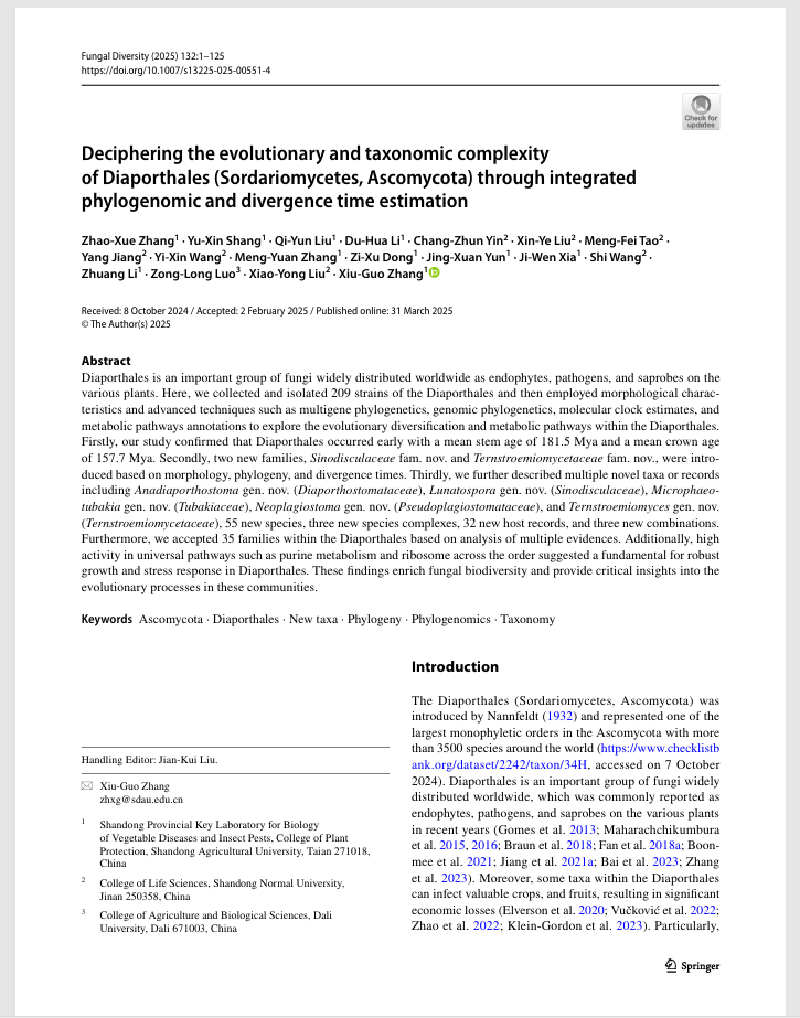 Zhang X Z ,Shang X Y ,Liu Y Q , et al. Deciphering the evolutionary and taxonomic complexity of Diaporthales (Sordariomycetes, Ascomycota) through integrated phylogenomic and divergence time estimation. Fungal Diversity,2025,132(1):1-125.
