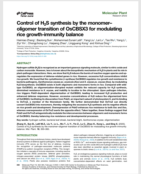Zhang H ,Sun B ,Latif Z M , et al.Control of H2S synthesis by the monomer-oligomer transition of OsCBSX3 for modulating rice growth-immunity balance. Molecular plant,2025,18(2):350-365.