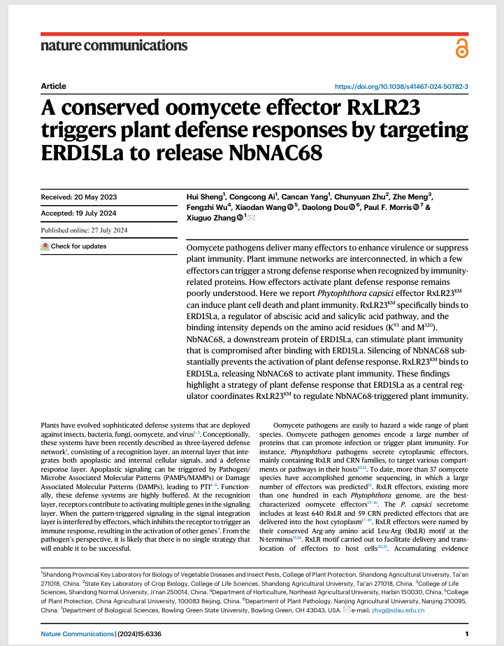 Sheng, Hui, et al. A conserved oomycete effector RxLR23 triggers plant defense responses by targeting ERD15La to release NbNAC68. Nature Communications, 2024,15(1): 6336.
