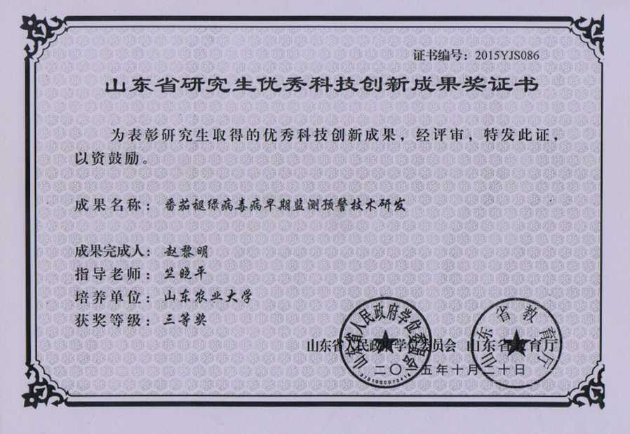 番茄褪绿病毒病早期监测预警技术研发,山东省研究生优秀科技创新成果奖三等奖,赵黎明,2015年10月