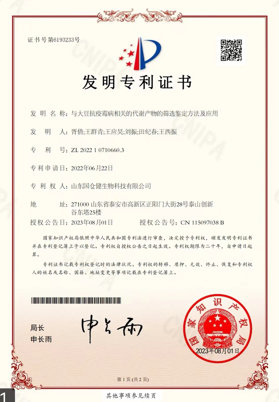 与大豆抗疫霉病相关的代谢产物的筛选鉴定方法及应用,发明专利,ZL.202210710660.3