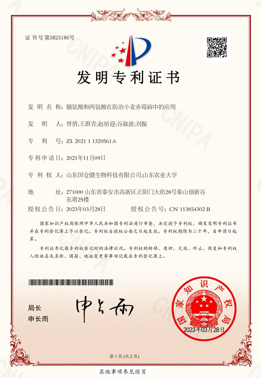 脯氨酸和丙氨酸在防治小麦赤霉病中的应用,发明专利,ZL.202111320561.6
