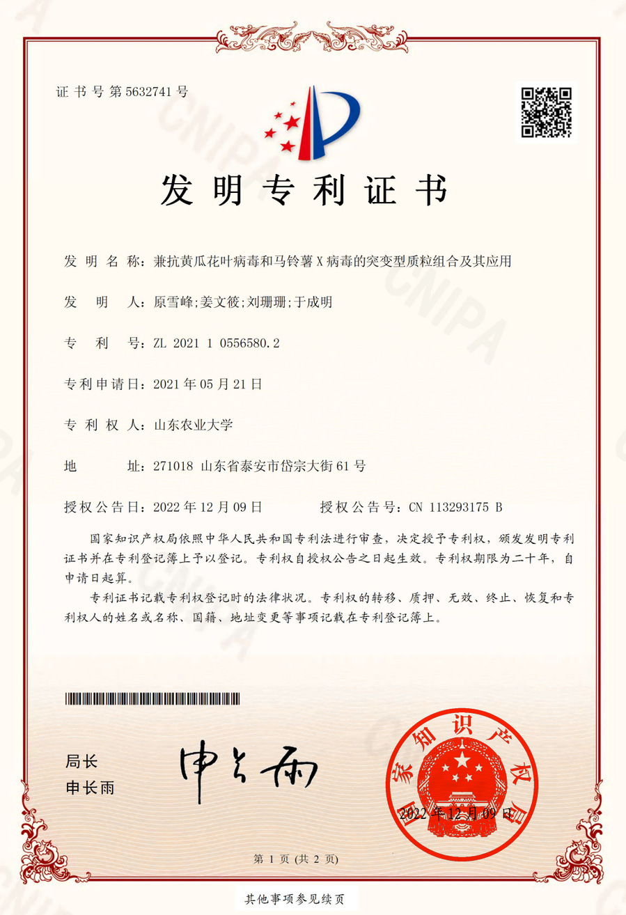 兼抗黄瓜花叶病毒和马铃薯X病毒的突变型质粒组合及其应用,发明专利,ZL202110556580.2