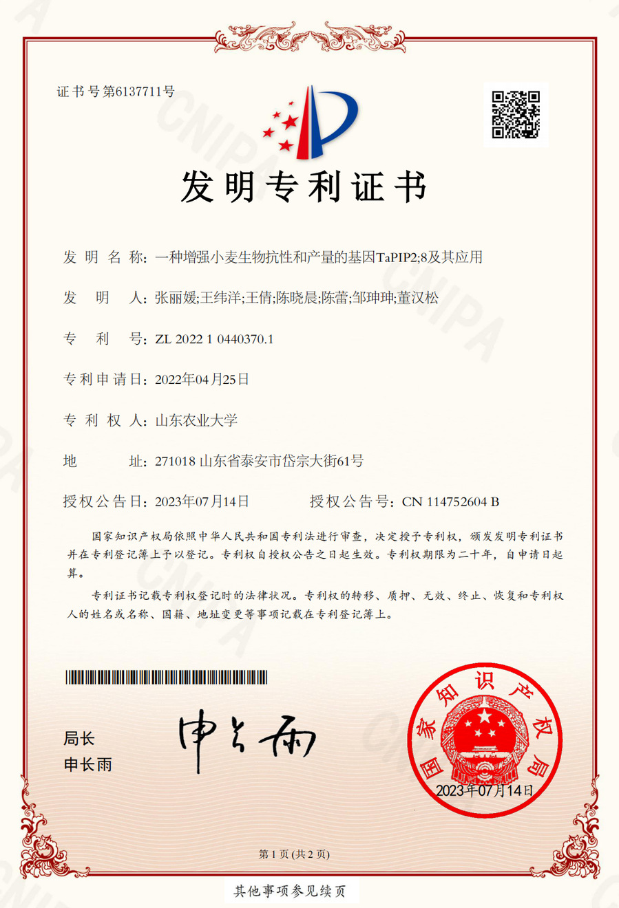 一种增强小麦生物抗性和产量的基因TaPIP2;8及其应用,发明专利,ZL 2022 1 0440370.1