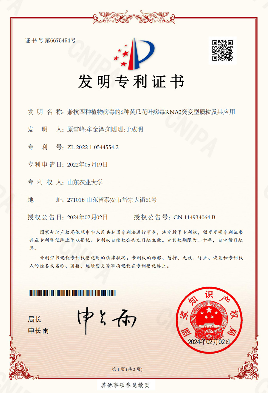 兼抗四种植物病毒的6种黄瓜花叶病毒RNA2突变型质粒及其应用,发明专利,ZL202210544554.2