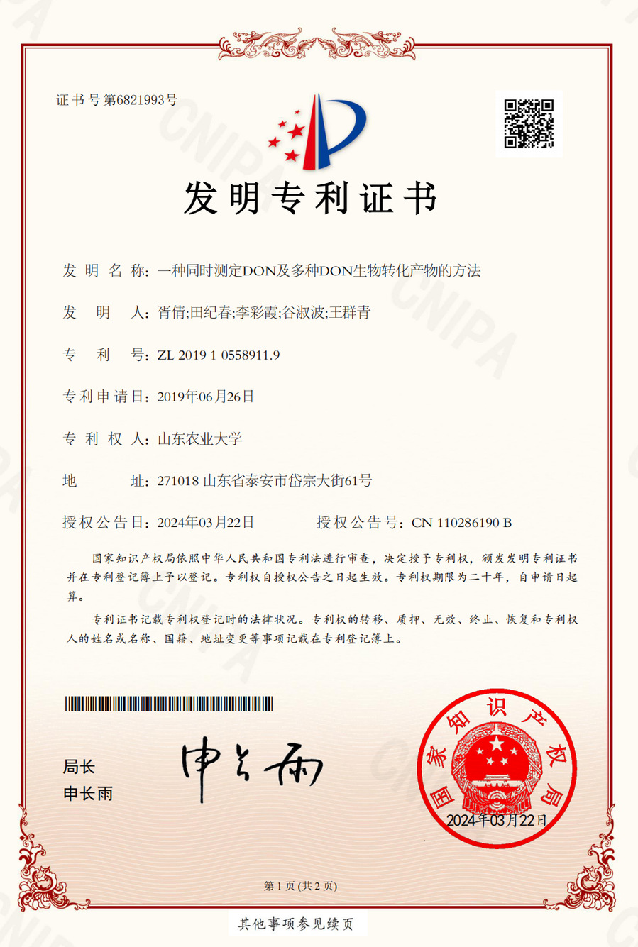 一种同时测定DON及多种DON生物转化产物的方法,发明专利,ZL.201...
