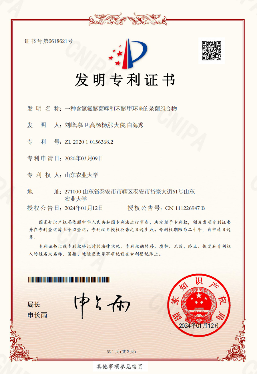 一种含氯氟醚菌唑和苯醚甲环唑的杀菌组合物,发明专利,ZL 2020 1 0156368.2