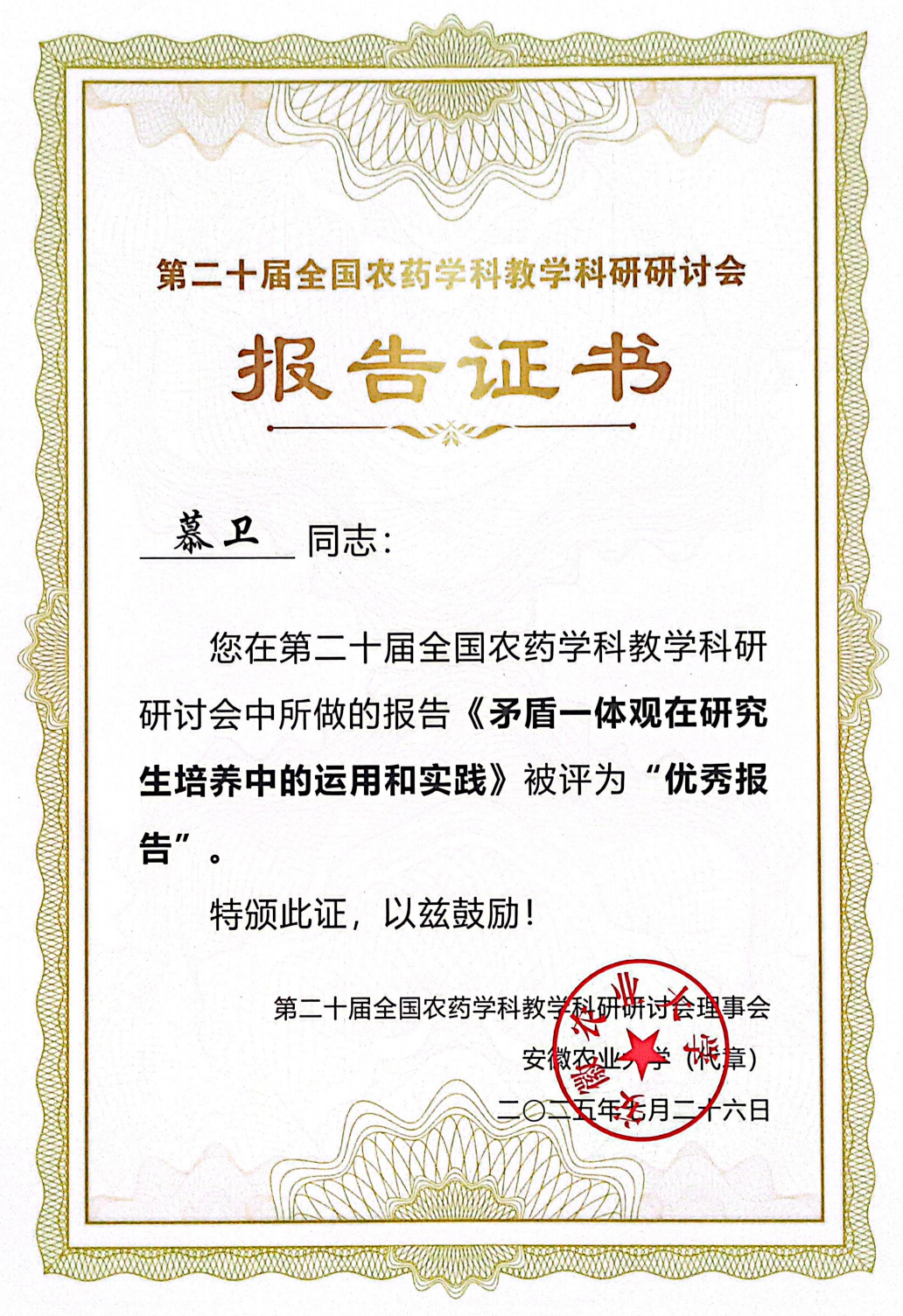 全国农药学科教学科研研讨会优秀报告:矛盾一体观在研究生培养中的运用和实践》,慕卫,2025年