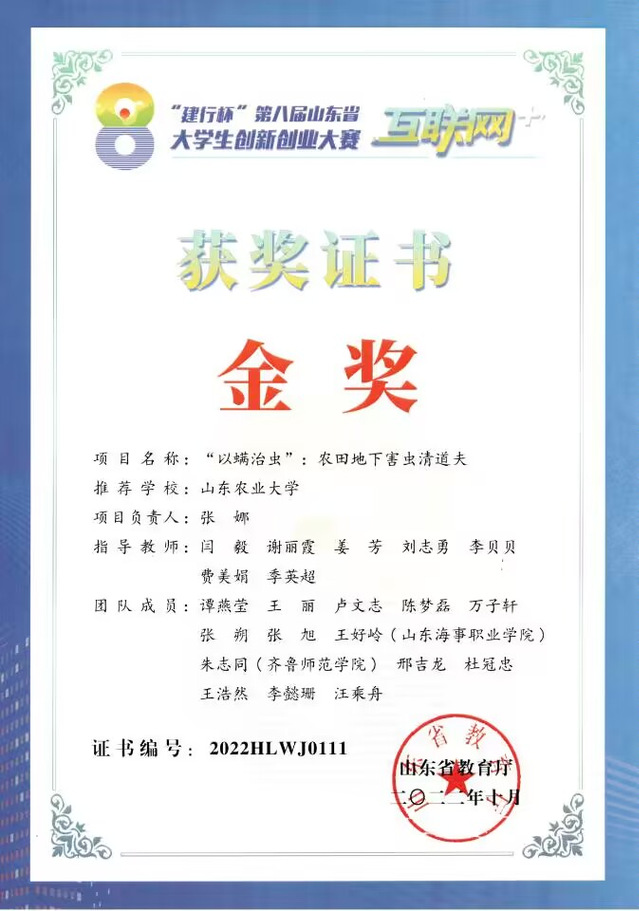 “以螨治虫”:农田地下害出清道夫,“建行杯”第八届山东省大学生创新创业大赛互联网+金奖,山东省教育厅,2022年10月