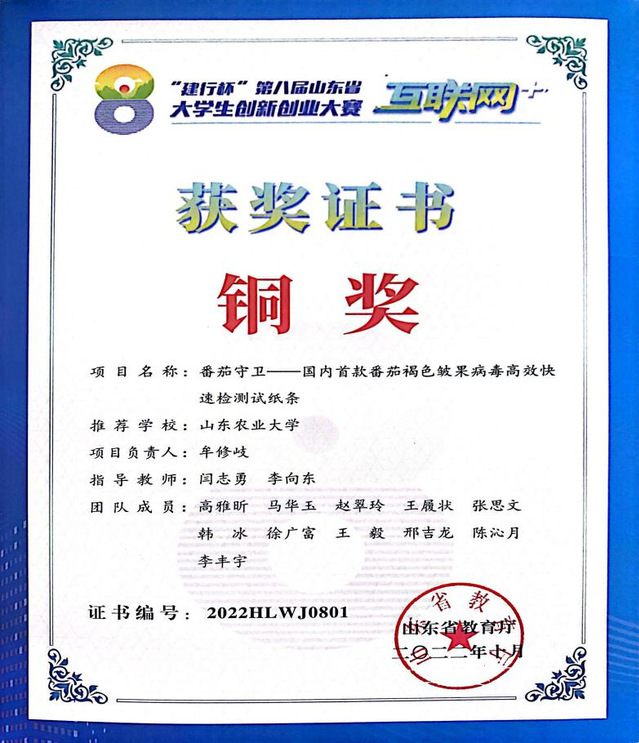 番茄守卫——国内首款番茄福色皱果病毒高效快速检测试纸条,“建行杯”第八届山东省大学生创新创业大赛互联网+铜奖,山东省教育厅,2022年10月