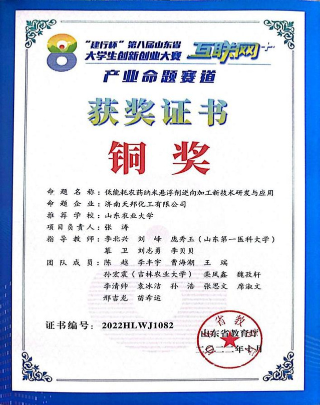 低能耗农药纳米悬浮剂逆向加工新技术研发与应用,“建行杯”第八届山东省大学生创新创业大赛互联网+产业命题赛道铜奖,山东省教育厅,2022年10月