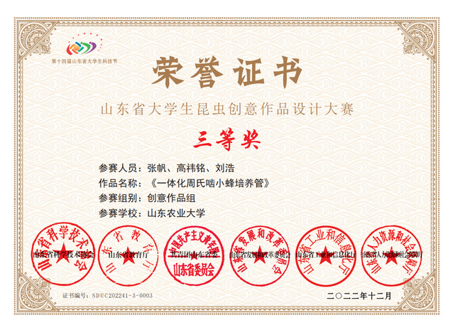 《一体化周氏小蜂培养管》,山东省大学生昆虫创意作品设计大赛三等奖,山东省科学技术协会、山东省教育厅、共青团山东省委、山东省发展和改革委员会、山东省工业和信息化厅、山东省人力资源和社会保障厅,2022年12月