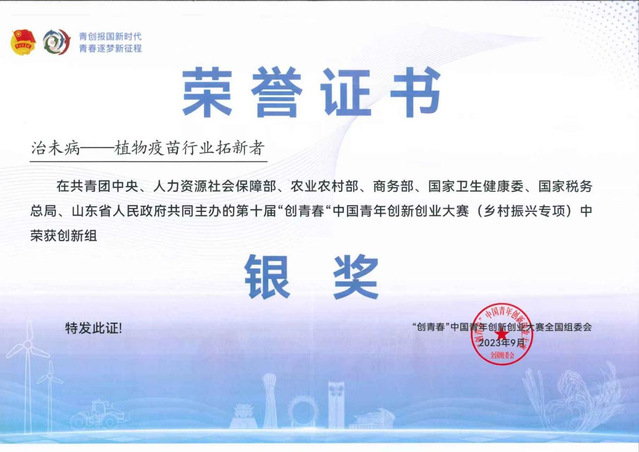 治未病--植物疫苗行业拓新者,第十届“创青春”中国青年创新创业大赛(乡村振兴专项)创新组银奖,“创青春”中国青年创新创业大赛全国组委会,2023年9月