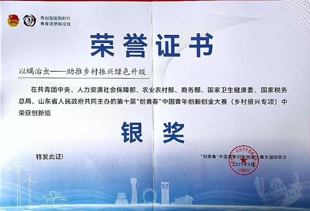 以螨治虫--助推乡村振兴绿色升级,第十届“创青春”中国青年创新创业大赛(乡村振兴专项)创新组银奖,“创青春”中国青年创新创业大赛全国组委会,2023年9月