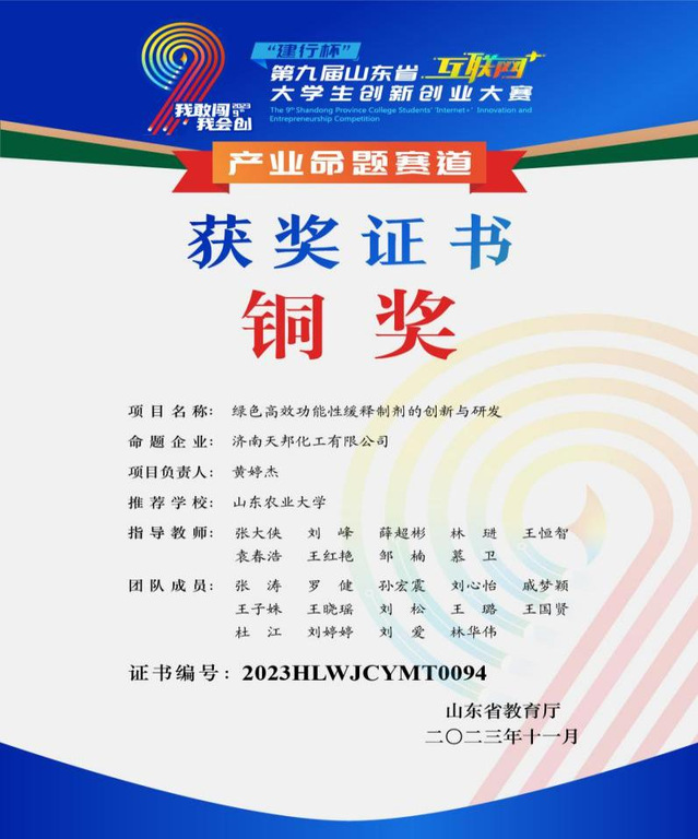 绿色高效功能性缓释制剂的创新与研发,第九届山东省互联网+大学生创新创业大赛铜奖,山东省教育厅,2023年11月