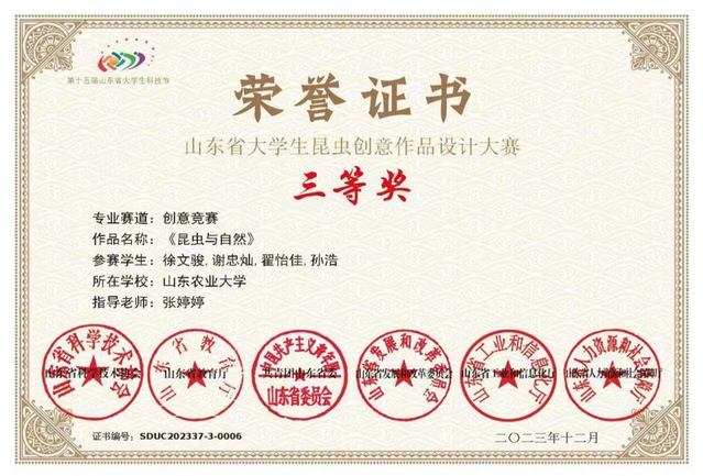 《昆虫与自然》,山东省大学生昆虫创意作品设计大赛三等奖,山东省科学技术学会、山东省教育厅、共青团山东省委、山东省发展和改革委员会、山东省工业和信息化厅、山东省人力资源和社会保障厅,2023年12月