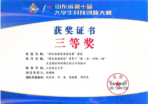 “绿色低碳转型”背景下“猪一沼一作物一猪生态循环种养模式助力乡村振兴,山东省第十届大学生科技创新大赛三等奖,山东省教育厅,2024年3月