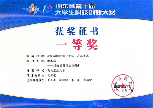 治未病-植物疫苗行业拓新者,山东省第十届大学生科技创新大赛一等奖,山东省教育厅,2024年3月