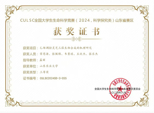 乙烯调控灵芝三生物合成的机理研究,第九届全国大学生生命科学竞赛省赛三等奖,全国大学生生命科学竞赛山东省赛区委员会,2024年8月