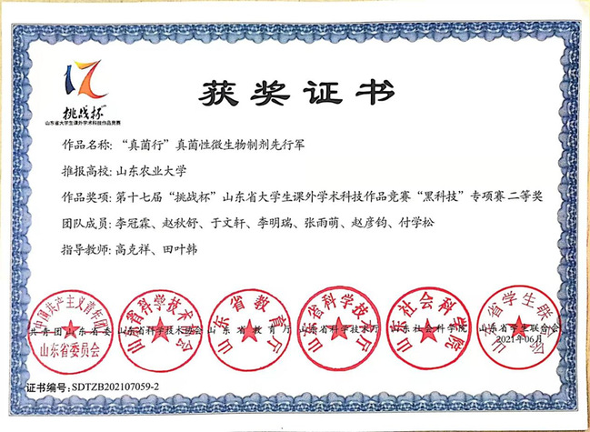 “真菌行”真菌性微生物制剂先行军,第十七届“挑战杯”山东省大学生课外学术科技作品竞赛“黑科技”专项赛二等奖,共青团山东省委、山东省科学技术协会、山东省教育厅、山东省科学技术厅、山东社会科学院、山东省学生联合会 ,2021年6月