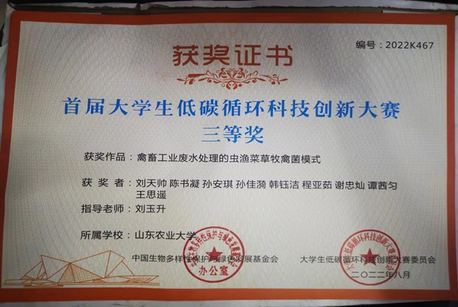 禽畜工业废水处理的虫渔菜草牧离菌模式,首届大学生低碳循环科技创新大赛三等奖,中国生物多样性保护与绿色发展基金会、大学生低碳循环科技创新大赛委员会,2022年8月