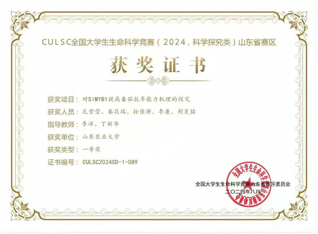 对SIMYB1提高番茄抗早能力机理的探究,第九届全国大学生生命科学竞赛省赛一等奖,全国大学生生命科学竞赛山东省赛区委员会,2024年8月