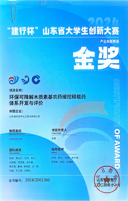 环保可降解木质素基农药缓控释载药体系开发与评价,山东省大学生创新大赛金奖,山东省教育厅,2024年11月