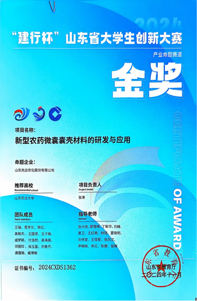 新型农药微囊囊壳材料的研发与应用,山东省大学生创新大赛金奖,山东省教育厅,2024年11月