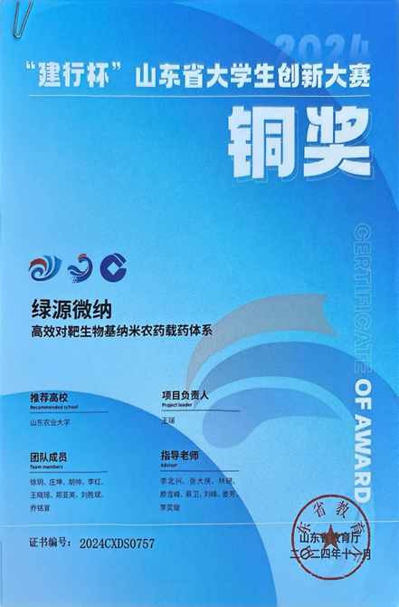 绿源微纳—高效対靶生物基纳米农药载药体系,山东省大学生创新大赛铜奖,山东省教育厅,2024年11月