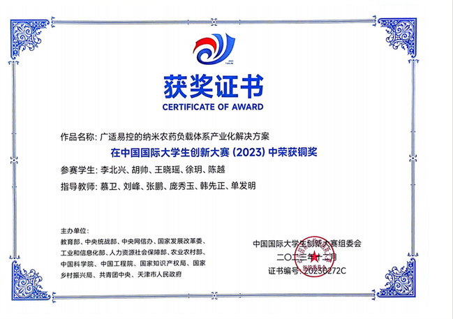 广适易控的纳米农药负载体系产业化解决方案,中国国际大学生创新大赛(2023)铜奖,中国国际大学生创新大赛组委会,2023年12月