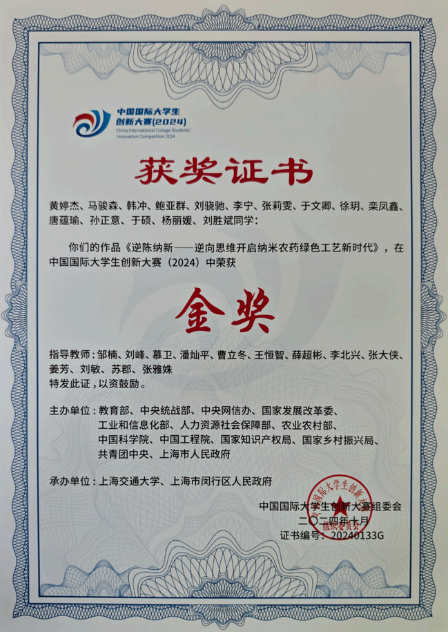 逆陈纳新-逆向思维开启纳米农药绿色工艺新时代,中国国际大学生创新大赛(2024)金奖,中国国际大学生创新大赛组委会,2024年12月