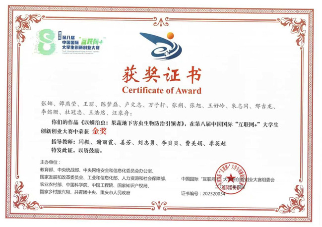 《以螨治虫:果蔬地下害虫生物防治引领者》,第八届中国国际“互联网+”大学生创新创业大赛金奖,中国国际“互联网+”大学生创新创业大赛组委会,2023年4月